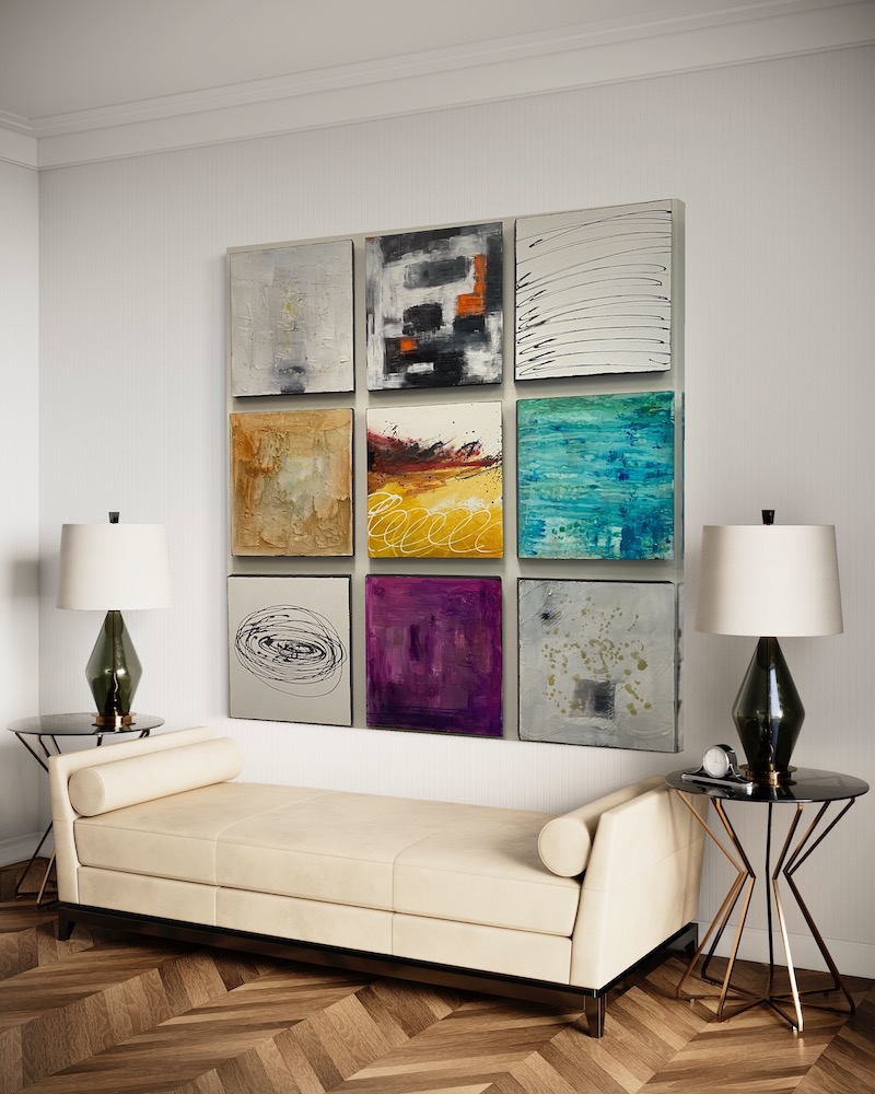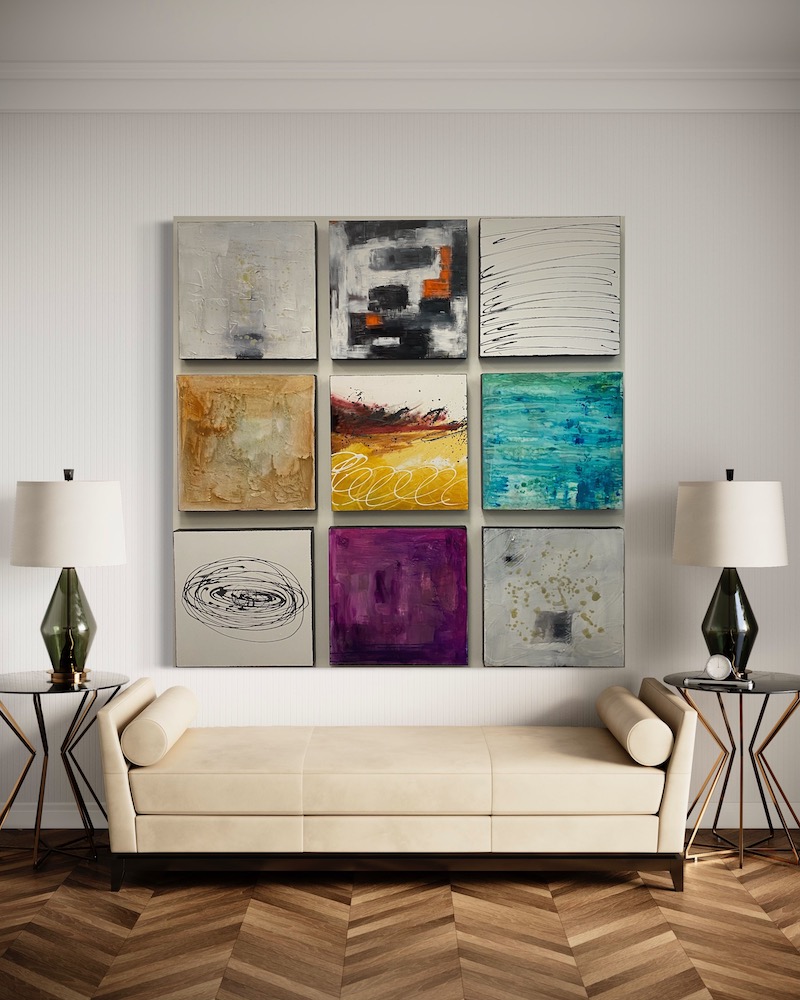 “Desert Dreams” Abstract Pairings 70″x70″ Each of the Nine Canvases are 22”x22”x3” = total of 70″x70″ $1,200.00 each.  Originals, Acrylic Paint on Canvases.